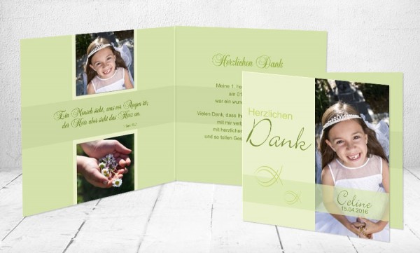Auf insgesamt 4 Seiten dieser hochwertigen quadratischen Klappkarte können Sie Ihr Dankeschön formulieren und mit Fotos und Sprüchen an diesen wundervollen Tag der Kommunion erinnern.