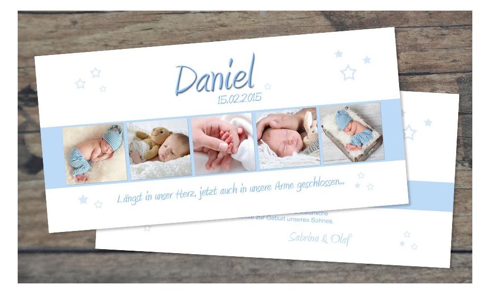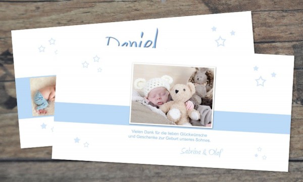 Diese wunderschöne Dankkarte zur Geburt Ihres Kindes berührt Herzen. Sie können insgesamt 6 Fotos in Szene setzen und Ihren Liebsten ein herzliches Dankeschön aussprechen. Diese DIN lang Karte Unser Herz ist in zarten Rosa- und Blautönen gestaltet. Die wunderschön aufgereihte Bildergalerie lässt Platz für Ihre schönsten Fotos. Auf der Rückseite können Sie das beste Fotos Ihres Schatzes unterbringen. Die kleinen süßen Sternchen laden zum Träumen ein. Alles in allem werden Sie mit dieser schönen Dankkarten die Herzen Ihrer Lieben berühren.
