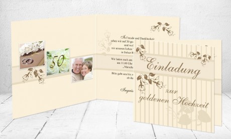 Wenn Sie es geschafft haben, Ihre Goldene Hochzeit feiern zu können, dann können Sie sich sehr glücklich schätzen. Blicken Sie zurück auf 50 Ehejahre, die sicher durch Höhen und Tiefen geprägt wurden. Gerne erstellen wir Ihnen für diesen besonderen Anlass Ihre ganz persönlichen und individuellen Einladungskarten zur Goldhochzeit. Entsprechend Ihrer ausgewählten Musterkarte sowie Ihren Farb- und Änderungswünschen gestalten wir Ihnen mit Ihrem persönlichen Einladungstext und Ihren Fotos IHRE Einladung zur Goldhochzeit. Den Gestaltungsentwurf senden wir Ihnen per Email zu und selbstverständlich ist dieser Service bei Bestellung kostenlos für Sie.
